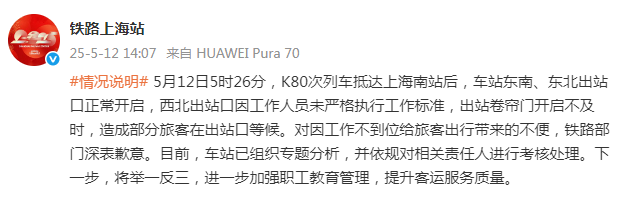 铁路上海站官方微博5月12日发布情况说明,5月12日5时26分,K80次列车抵达上海南站后,车站东南、东北出站口正常开启,西北出站口因工作人员未严格执行工作标准,出站卷帘门开启不及时,造成部分旅客在出站口等候。对因工作不到位给旅客出行带来的不便,铁路部门深表歉意。目前,车站已组织专题分析,并依规对相关责任人进行考核处理。下一步,将举一反三,进一步加强职工教育管理,提升客运服务质量。